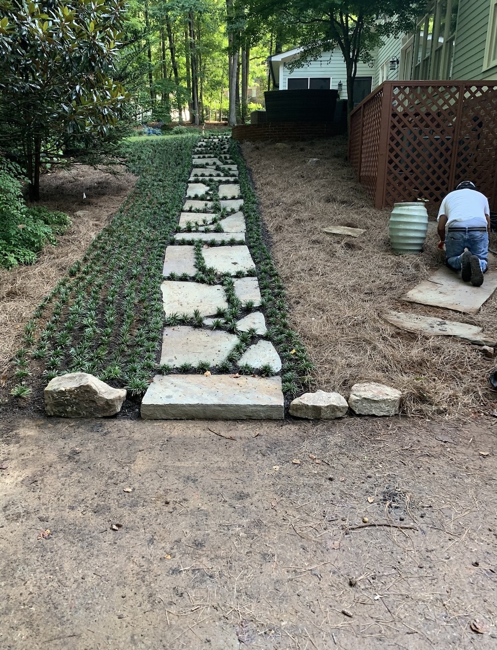 A client wanted a lush, “evergreen” feel between her stepping stones that could handle foot traffic and look pristine year-round.